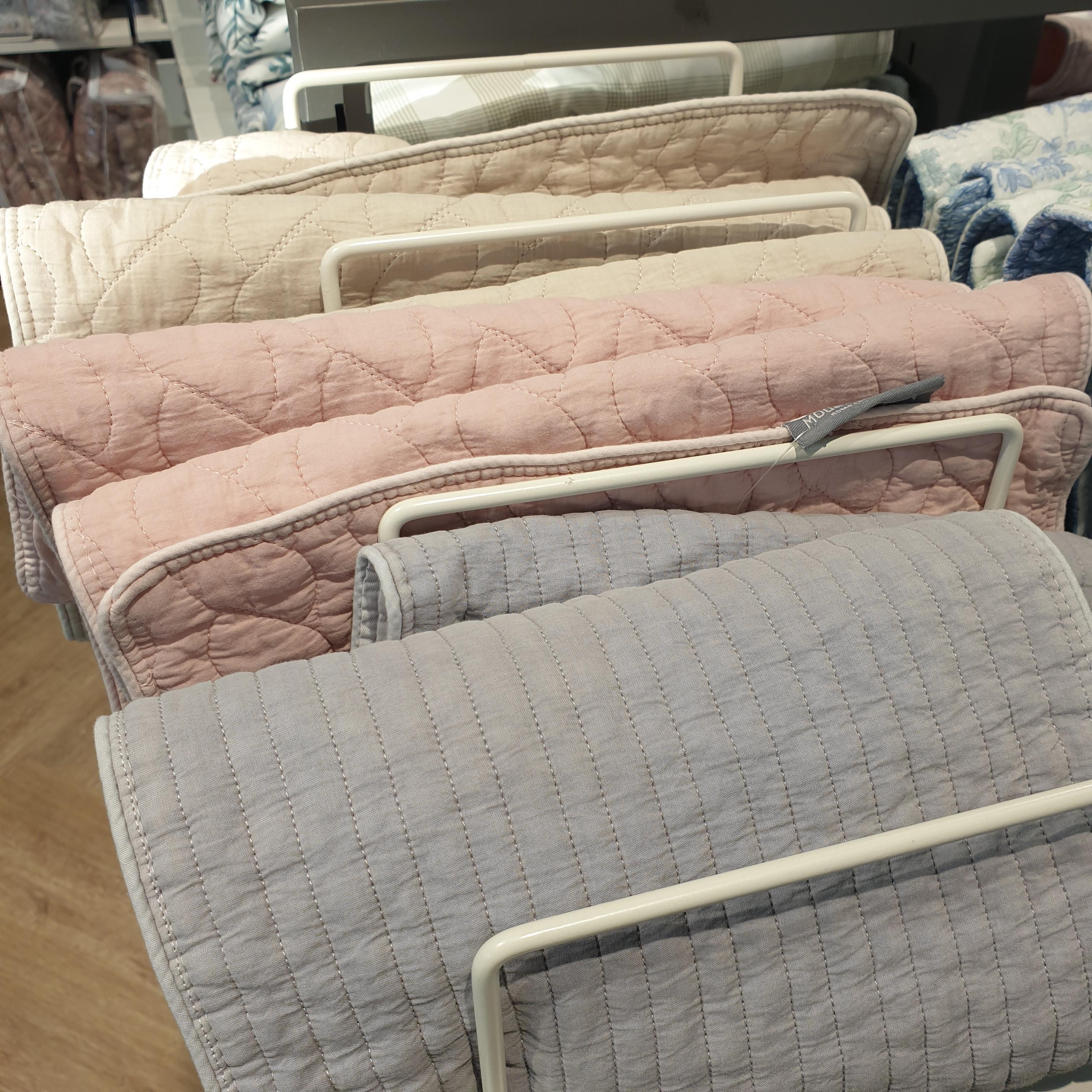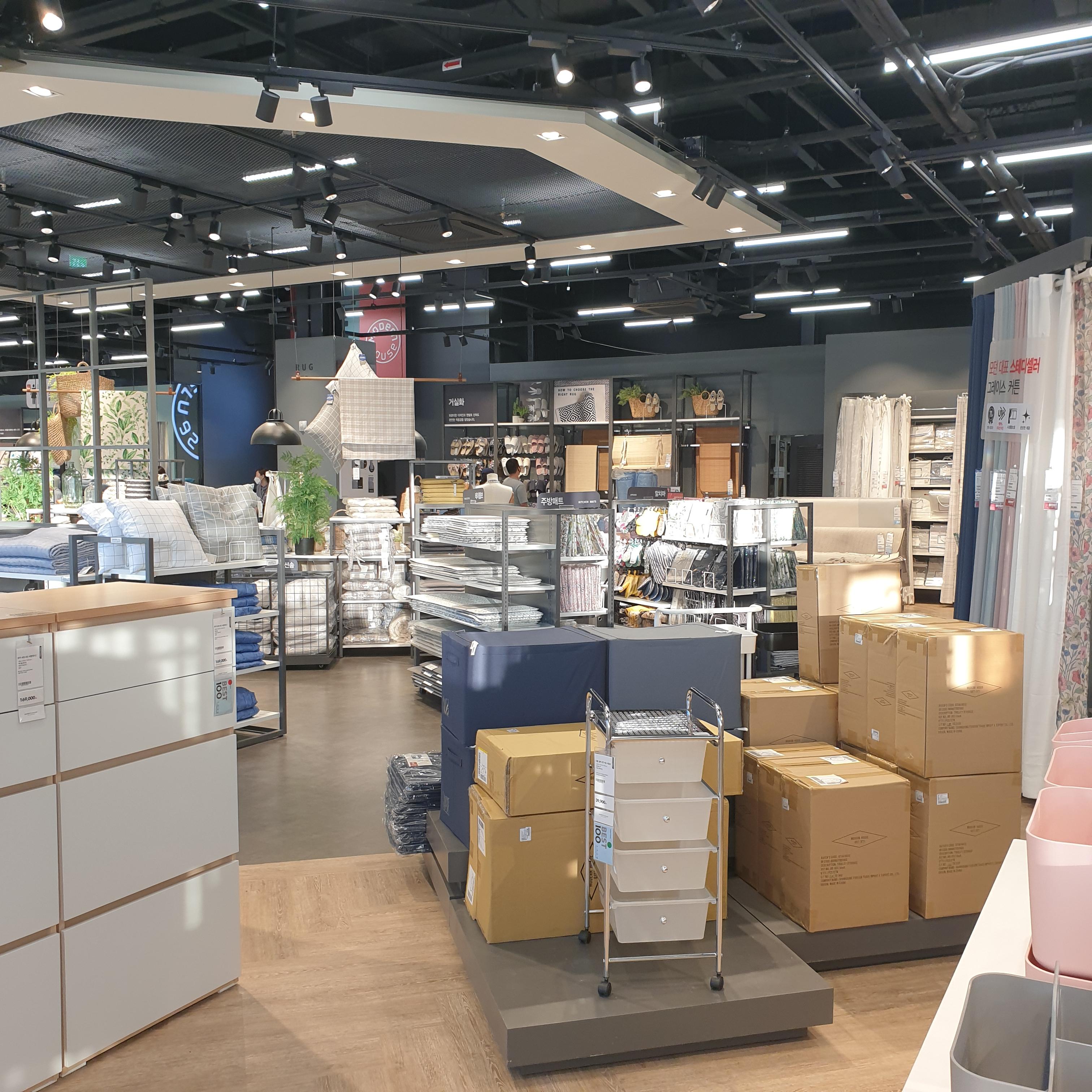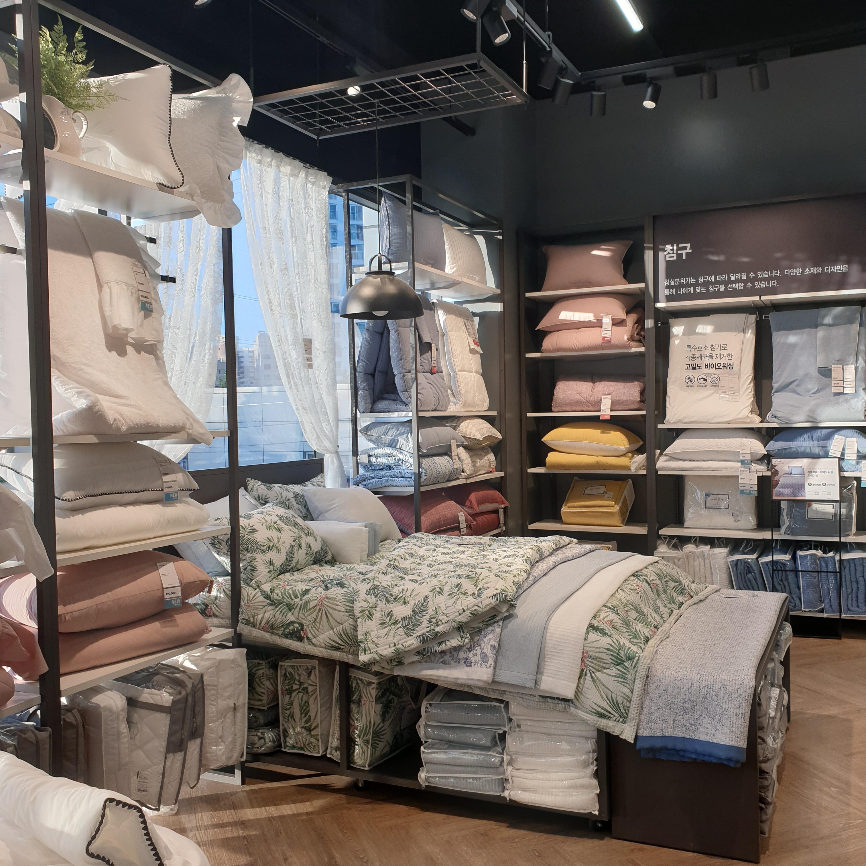 2층에는 가구, 수납함, 침구류, 어린이용 제품이 있음.
