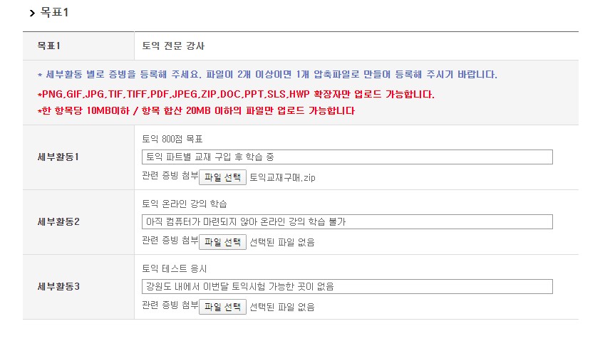 각 목표에 따른 세부 활동 내역을 입력하면 되는데요